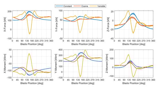 The propeller design parameters and the parameters used for the modelling of the CVP propeller are listed in Table A1 in Appendix B. The inertia, gravitational and hub loads are determined using the parameters in Table A1, and the modelling approaches described in Section 2 for each of the pitch trajectory in Figure 6. The hydrodynamic loads and their uncertainty are determined using the simulation approach described in Section 2 for each of the pitch trajectories. These loads are shown in Figure 7.