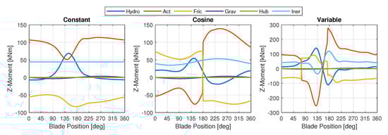 The bearing, frictional and actuator loads are determined by using Algorithm 1 and are determined for each of the three pitch trajectories. The determined torques about the spindle axis are shown in Figure 8 for each of the pitch trajectories.