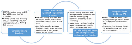The remainder of this paper is organized as follows. Section 2 introduces the study system and WECC-1 RAS, followed by the training and testing dataset generation in Section 3. The deep learning model and the customized loss function are proposed in Section 4. In Section 5, the model performance is validated, and the adaptive RAS is compared with traditional RAS. Finally, Section 6 concludes this paper. The flow chart of the whole process in the paper is shown in Figure 1.