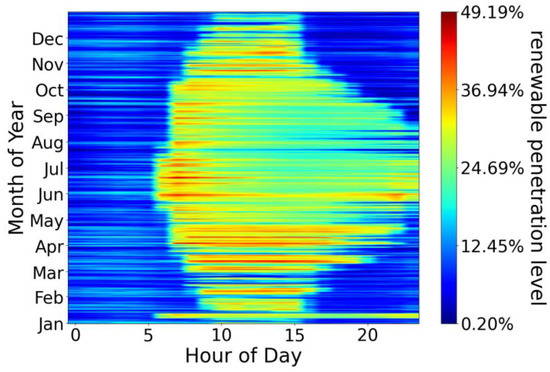 This study is based on the reduced WECC 240-bus system model developed by the National Renewable Energy Laboratory (NREL), which has the generation of different fuel types, e.g., coal, gas, bio, nuclear, hydro, wind, and solar [16]. The wind and solar generation penetration level varies between 0.2% and 49.2% across 8786 hourly dispatches for an entire year of 366 days. Figure 2 shows the renewable penetration level across one year. In the figure, it shows that the renewable penetration is higher during the daytime than during the nighttime due to the availability of renewable energy.