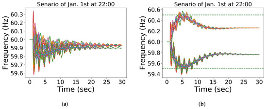 For each dispatch, multiple simulations are performed to find the optimal load increase or load decrease amount. Those values are always less than the tie line active power flows. Taking one dispatch (1st January, hour 22), for instance, Figure 4a shows the frequency of two islands when WECC-1 RAS performs the load increase and load decrease according to the total tie-line flows, while Figure 4b shows the frequency of two islands when WECC-1 RAS performs the optimal load increase and load decrease. Note that the average frequency of each bus is used to present the bus frequency of each island. Under this dispatch, the total tie-line flows between the two islands are 6177.9 megawatt (MW) and −6073.3 MW, respectively. The optimal load increase and decrease are 2996.9 MW and −4928.9 MW, respectively. The optimal load increase and load decrease values are less than the total tie-line flows while maintaining the frequency above 59.5 Hz and below 60.5 Hz.
