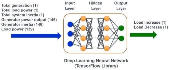 ANN claims that one hidden layer is able to represent any nonlinear function; however, deep learning neural networks can use multiple layers to abstract the information based on the previous layer and progressively abstract the input features, resulting in better generalization [18]. As shown in Figure 6, this paper uses a fully connected feedforward neural network with more than one hidden layer to map the operating conditions to the optimal WECC-1 RAS corrective actions. The operating conditions include total generation, total load, total inertia, power output of each generator, inertia of each generator, and each load. The outputs are the corrective actions, such as load increase MW amount and load decrease MW amount in two islands, respectively.