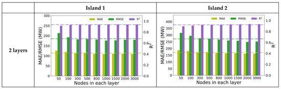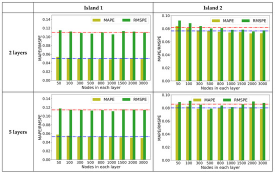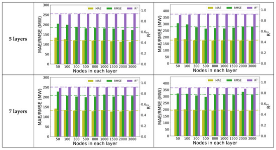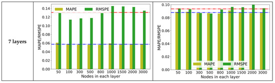 Figure 8 shows different models’ performances with metrics MAE, RMSE, and . The model with two hidden layers and the model with five hidden layers have similar performances. Figure 9 shows different models’ performances with metrics MAPE and RMSPE. The model with two hidden layers and 1000 nodes in each layer has the best performance overall. However, the model with two hidden layers and 300 nodes in each layer’s performance improved a lot from 50 nodes in each layer to 300 nodes in each layer. The model’s performance with 1000 nodes in each layer did not improve dramatically when nodes were increased from 300 to 1000 in each layer. In this paper, considering that the complex model is more likely to be overfitted and hard to train, the model with two hidden layers with 300 nodes was selected as the optimal model structure instead.