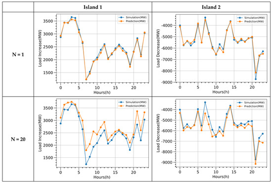 Figure 10 shows one-day testing cases’ load shedding (load decreasing) and generation trip (load increasing) amount prediction after RAS in two islanded systems, respectively, based on the model without penalization (N = 1) and with penalization (N = 20). It shows that the prediction result based on the model without penalization has better accuracy and is closer to the ground truth compared to the result based on the model with penalization (N = 20), but it does not have the safety margin and will trigger the over-frequency generation trip and under-frequency load shedding. The prediction result based on the model with penalization shows a good safety margin in Figure 10, with very few cases having frequency violations.