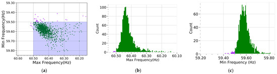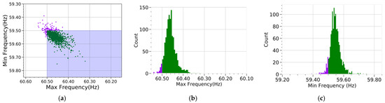 Maximum and minimum frequency and histograms of Island 1 and Island 2: N = 20 (purple: outside secure region, green: inside secure region, shaded area: secure region). (a) Max. and Min. frequency; (b) Max. frequency histogram in Island 1; (c) Min. frequency histogram in Island 2.
