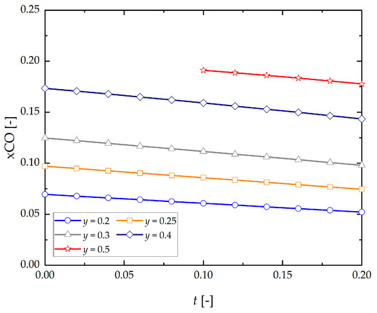 - As steam content added to the system in an area free from carbon deposition for a range of initial concentrations (t = 0–0.2; y = 0.2–y[C]) increases, there occurs a monotonic decrease in equilibrium concentrations of H2, CO, CH4 and an increase of CO2, H2O in the process being analyzed.