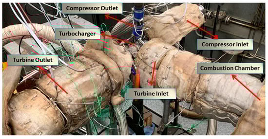 The turbocharger has been measured on the hot gas test bench at the chair of Integrated Modelling of Efficient Powertrain Systems at the Technical University, Berlin (Figure 2 and Figure A1). All the tests have been conducted using a mechanical compressor, allowing for combustion air pressures up to 4 bar and mass flows of up to 1400 kg/h. The test bench is capable of producing a wide temperature range (T3 up to 1050 °C) either via an electrical heater or a combustion chamber. The turbine mass flow rate is measured by a thermal mass flow meter (with a measuring accuracy of up to <0.8% of the measured value). Turbocharger rotational speed is captured using an eddy current measurement system. Pressures and temperatures have been recorded at the inlets and outlets of the turbine and compressor. Thermocouples of type K have been used to measure the temperatures at the exhaust side and PT100 for the compressor side, lubrication oil and coolants (for T3 > 800 °C). A mixing device has been also installed in the measurement pipe downstream from the turbine to make a homogenous temperature field and increase the temperature measurement accuracy of T4, as can be seen in Figure 3 [14].