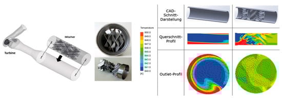 The V-element mixing device on the left-hand side of Figure 3 shows the structure of the device that has been placed downstream of the turbine, between the turbine outlet and the T4 measurement point. On the right are the results of a numerical comparison between standard measurement pipe and mixing element, showing the significant improvement of the homogenized temperature field, which is more suited for reliable T4 measurement.