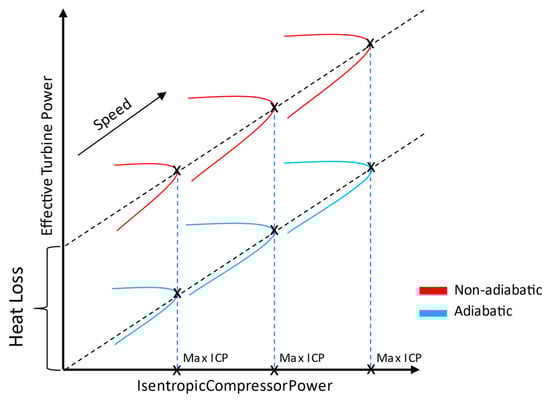 Figure 4 illustrates how the heat flows can be estimated using a power-based diagram. It can be seen that plotting the ETP over the ICP benefits a linear fitting of the points that correspond to the maximum ICP for every speed line. The fitting lines of both diabatic and adiabatic data can be extended to intercept the ordinate. Theoretically, at the zero ETP/ICP point, the rotational speed and, thus, the friction losses are zero. Moreover, the fitting line of the operating points at maximum isentropic compressor power in adiabatic conditions indicates the origin being at the zero point. Therefore, the vertical offset between non-adiabatic and adiabatic fitting lines in the ETP axes represents the heat loss from the turbine. Consequently, heat losses can be directly extracted from the experimental data, and it is then possible to calculate the corrected aerodynamic power and isentropic efficiency of the turbine solely from the measurement data. This approach offers a reasonable trade-off between the accuracy of results and high calculation costs, through using CHT analysis as well as measurement time (in the case of adiabatic measurements) compared to standard measurement methods. In addition to that, it is independent of the turbocharger geometry information and there is not any requirement for a calibration process.
