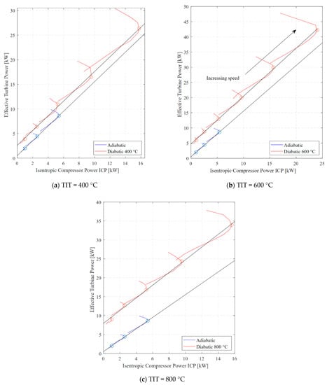 The results of the heat transfer estimation for different turbine inlet temperatures (TIT) are shown in the form of a power-based diagram in Figure 5 The investigated operating points are indicated by a circle and correspond to the highest ICP of every speed line, starting from 37 k RPM and increasing in increments of 13 k RPM, up to 87 k RPM for 400 °C and 800 °C TIT, and 100 k RPM for 600 °C. The isentropic compressor power and effective turbine power are calculated according to Equations (1) and (3). The results of the adiabatic measurements in this diagram help to better visualize the heat loss for each diabatic scenario with respect to the adiabatic data. A line has been fitted through every maximum ICP operating point. Based on the ordinate intercept for each TIT scenario, the heat loss can be quantified to calculate the corrected turbine aerodynamic power according to Equation (2) and, thus, also the turbine isentropic efficiency .