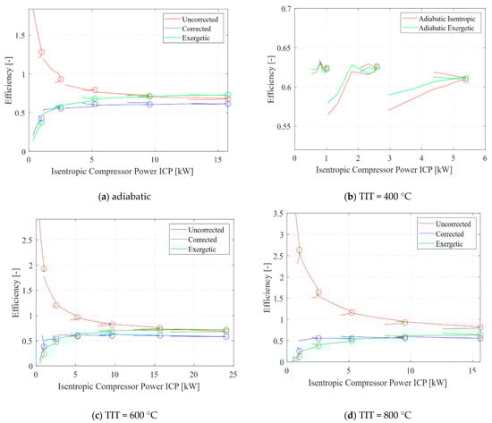 Different turbine efficiencies, plotted over the ICP, under different operating conditions (a) adiabatic (b) TIT = 400 °C (c) TIT = 600 °C (d) TIT = 800 °C.
