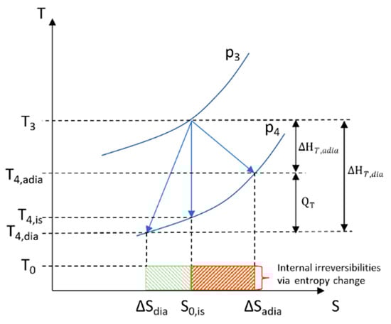 The entropy change of the expansion process in the turbine can be explained in detail using the T-S diagram (Figure 7). This diagram describes a simple expansion process from state 3 (T3, p3) to state 4 (T4, p4).