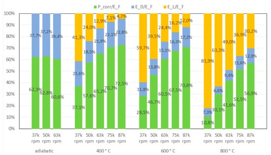 The impact of exergy loss due to heat transfer is clearly dominant, and this is the major cause of the lower exergy efficiency. Consequently, the heat loss is most dominant at lower speeds. For a TIT of 800 °C and a speed at 37 k RPM of the turbine, the exergy loss via heat transfer reaches up to 81.9%, and for a TIT of 400 °C, the exergy loss still contributes 41%.