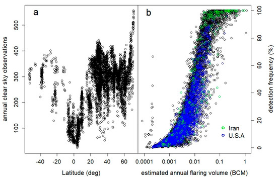 (a) Available clear-sky flare observations by VIIRS in 2019 versus latitude; (b) 2019 detection frequency (ratio of observations of a flare detected under cloud-free conditions to total observations for that location under cloud-free conditions) as a function of estimated flaring volume (BCM = billion cubic meters, per year), demonstrating that large flares operate nearly continuously, while small flares tend to be intermittent.