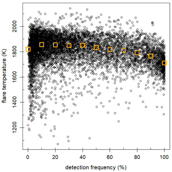 Average flare temperatures as a function of detection frequency (2019 data), illustrating that high detection frequencies, associated with the largest estimated flaring volumes (Figure 1b), are related to flares with lower remotely sensed flame temperatures. Orange squares mark 10%-binned (0–5%, 5–15%, 15–25%, etc.), median flare temperatures per detection frequency bin.