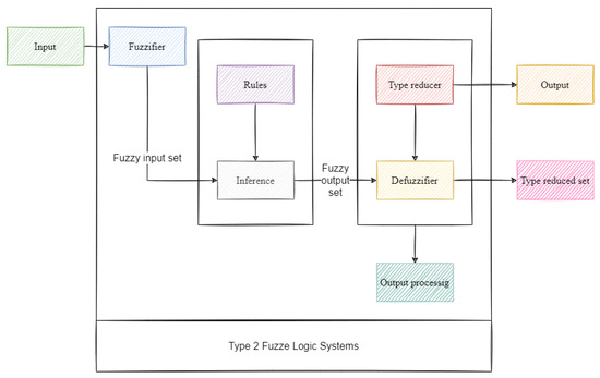 The deliberate type 2 fuzzy logic system is represented in Figure 2. For our description, we considered the issue with the identification of a PV failure detection stabilization system. It was necessary to evaluate the state variables and their angular distance. The actual dynamic equation of the device, which we believe to be unknown: