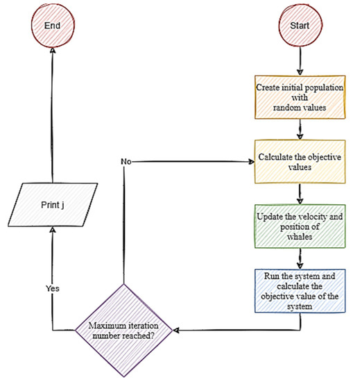 From that, the optimal solutions were obtained, where a random whale position vector is selected from the current population. The controller’s transition function is usually written as an Equation (15):