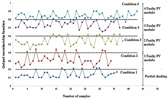 The input membership functions of the fuzzy logic system could become much more complex if the investigated PV installation had a large number of PV modules (more than 100 PV modules), since each PV module has the potential to influence the total input membership function. To test the technique, all the faulty simulated faulty scenarios were used, with 2779 experimental samples. The three faulty cases’ accuracy was just 98.27 percent. This experimental circumstance was made evident by the strange weather circumstances, which included episodes of inconsistent irradiance. In the 0, 1, 8, and 9 faulty instances, which delivered 100% accuracy, it was found that a greater precision was present. Of course, we discovered every flaw we studied using the tools’ findings—the short-circuited fault detection accuracy of 99.28% using the suggested technique. We could see that the output power decreased if we isolated one string.