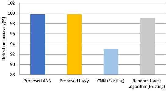 As can be seen, the calculated data were contrasted with the theoretical curve limits for the specific experiments. The bulk of the calculated data during the study duration fell beyond the theoretical curves’ high and low detection limits. The DA was determined and listed in Table 3 and Figure 6. The overall DA was 99.8 percent for Type 2 Fuzzy and ANN, respectively. To check the efficiency of the proposed Fuzzy and ANN, it can be compared with other existing fault detection methodologies. Akram et al. (2019) proposed a novel CNN for fault detection in PV also, and Chen et al. (2018) proposed a random forest algorithm for detecting the faults. Hence, when compared to the other existing methodologies, the implemented algorithms detection accuracy was also high, the implemented methodology outperformed the other detection mechanisms, shown in Figure 7.