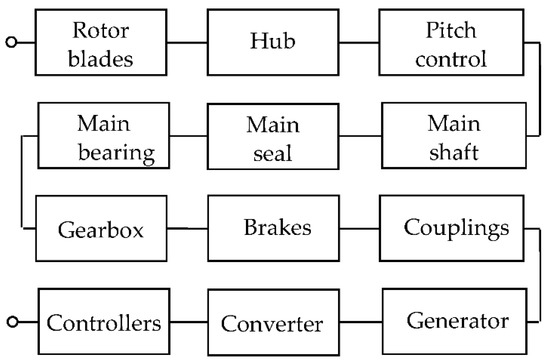 where λi is the failure rate of the component, because it is assumed in this study that the failure rate is treated as time-independent for the purpose of the reliability calculation. A case study illustrating the application of the method described in the previous section to the evaluation of the failure rates of key mechanical components of the PTO system such as the main seal and main bearing is presented next. These two components are critical for the operation of a HATT—if they fail, then the entire PTO system fails (see the reliability block diagram in Figure 1). Moreover, their failure can lead to failures of other PTO components, while their replacement in the case of failure is time-consuming and expensive (especially this concerns the main bearing).