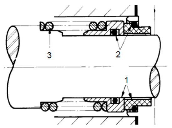 General arrangement of mechanical face seal: 1—seal faces; 2—secondary seals; 3—face loading elements (spring, bellows).