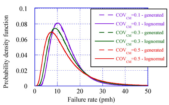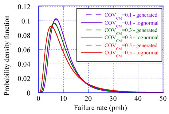 As explained previously, CM represents the model uncertainty or, in other words, various uncertainties associated with the method of the influence factors, i.e., Equation (11) for the seal. The latter equation is used to construct a prior distribution of the failure rate so that CM can also be used to represent the degree of belief in this prior. In the following, CM will be treated as a lognormal random variable with a mean of unity. Three values of its COV, denoted further as COVCM, representing different degrees of belief will be considered: 0.1—strong belief, 0.3—medium belief, and 0.5—weak belief. Since a lognormal distribution is skewed to the right its choice for CM also means that results obtained by the proposed method will tend to overestimate the failure rate, i.e., to be on a conservative side.