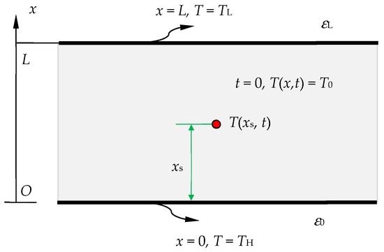where TH and TL are the temperatures at the walls of x = 0 and x = L, respectively, while T0 is the initial temperature. The transient temperature T(xs, t) at sensor position xs can be predicted by solving Equations (1)–(4).