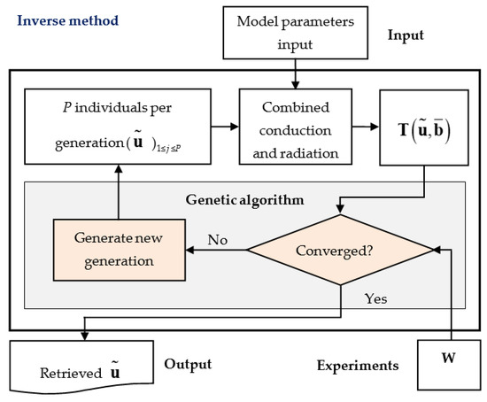 The genetic algorithm (GA), which is widely used for complex, ill-posed problems [25,26,27], was employed to solve the inverse identification problem. Figure 2 shows the block diagram of the GA-based inverse method used to determine parameter vector .
