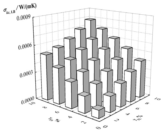 Figure 4 shows the estimated lower bound, , for the standard deviation of the conductive thermal conductivity, kc, with respect to various measurement noise and boundary temperature error values; the values considered for and ranged from 1% to 9%, with an increment of 2%, and the temperature sensor was located at xs = L/2.