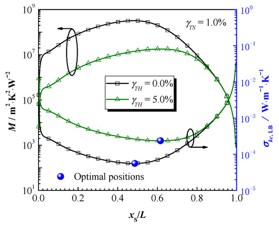 It can be seen from Figure 5 that the values first decreased, and then presented an increasing tendency with the increasing of the dimensionless sensor position xs/L. For = 0%, the optimal sensor position was in the vicinity of xs/L = 0.5, and the minimum value of was about W/(m∙K). Compared with the results for = 0%, the minimum value of for = 5% was increased to about W/(m∙K); furthermore, the optimal sensor position moved from xs/L = 0.5 to a position in the vicinity of xs/L = 0.6, due to the fact that the boundary temperature error affected the solution of the forward problem, especially for positions that were close to the boundary x = 0. Therefore, the sensor should be placed far away from the boundary to reduce its error effect.