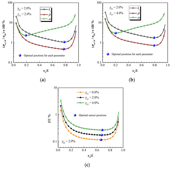 Figure 7a presents the values of with respect to dimensionless sensor location xs/L; the measurement noise considered here was = 2.0%. It is obvious that smaller values led to better retrieved results. The dimensionless positions corresponding to the minimum value of for kc, β and ω were xs/L = 0.76, 0.75, and 0.19, respectively, and the positions should have been the optimal sensor position for each parameter. It is interesting to note that the positions for each parameter were not consistent; therefore, the overall optimal sensor position could not be directly determined.