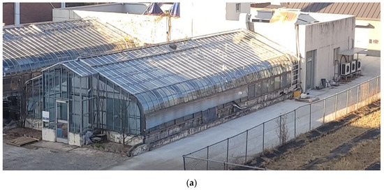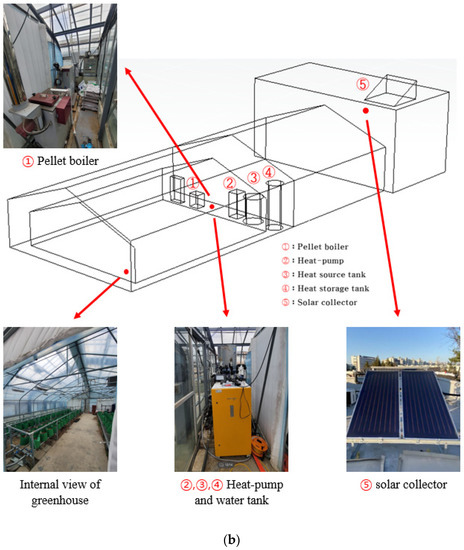A glass greenhouse with an area of approximately 90 m2 at Kangwon University in Chuncheon-si, Gangwon-do, Korea was selected in this study. This greenhouse, which is equipped with an insulating curtain as well as ventilation facilities, features a double structure with an additional internal greenhouse. The experiments were conducted with the internal greenhouse closed. The floor area of the internal greenhouse and the covering area was 68.37 and 121.44 m2, respectively. The heating load of the experimental system was calculated based on these areas, and the capacity of each piece of equipment used in the heating system was also selected in consideration of these areas (Figure 1).