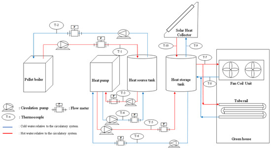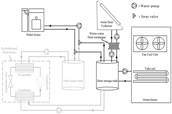 The thermal energy supply systems tested in the greenhouse included a 20,000 kcal/h-class pellet boiler (KN-23D, Kyuwon Tech, Gyeongsan, Korea), a 3RT-class hydrothermal heat pump (3RT, Inergy Technologies, Gwangsan-gu, Korea), and a 4.04 m2 solar heat collecting plate with a heat collection capacity of 2230 kcal/m2·day. Three hybrid systems were designed using these systems. The thermal energy supply device comprised a fan coil unit and a tube rail. Hybrid system 1 consisted of a hydrothermal heat pump system with a pellet boiler as the heat source. In hybrid system 2, a pellet boiler was used as the main heat source, and a solar collector was used as an auxiliary heat source for the heat storage tank. Hybrid system 3 consisted of a heat pump system that included all the heating systems, with a pellet boiler and a solar panel as the main heat source and the auxiliary heat source, respectively. The combined heating system is as shown in Figure 2.