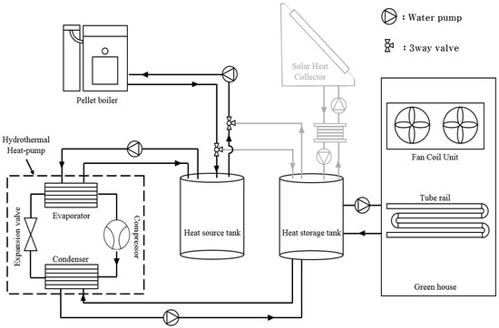 In accordance with this project, heating systems using pellet boilers and geothermal heat pumps are being supplied to farms in the ROK. However, several post-installation problems are associated with these thermal energy supply systems. On the one hand, pellet boilers are difficult to maintain and have fluctuating operational costs because of variations in the cost of the wood pellets that are used as fuel [10,11,12,13,14]. Consequently, some farmers revert to using fossil fuel boilers. On the other hand, hydrothermal heat pumps are known to have high thermal efficiency and high heat source stability in the ROK (Republic of Korea) compared with those of air heat source pumps [15,16]. Specifically, the hydrothermal heat pumps that are supplied to farmers under the project primarily use groundwater as a heat source. However, the supply of heat, in this case, is unstable, as it depends on the amount of groundwater available [17,18]. Moreover, hydrothermal heat pumps require exorbitant initial investment costs.