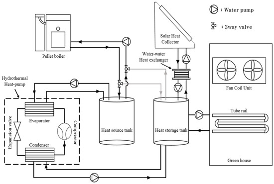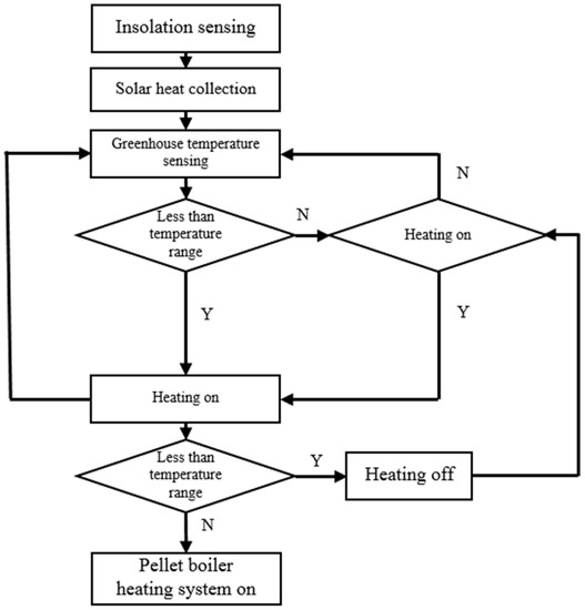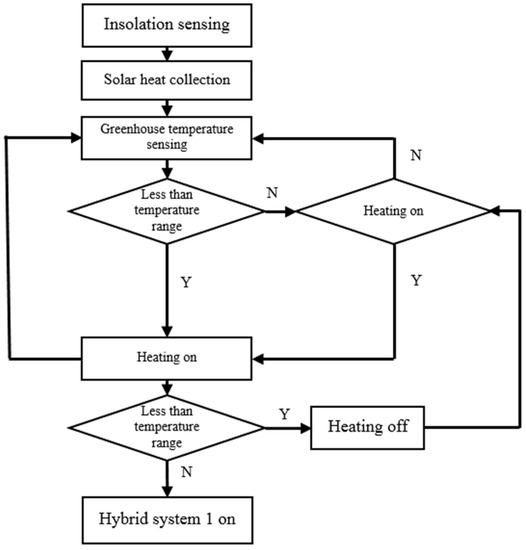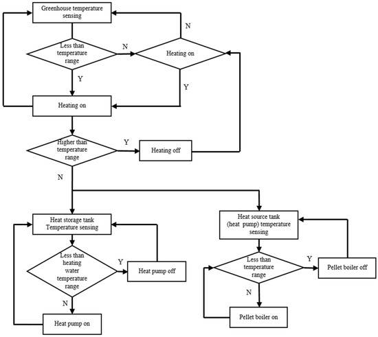 The overview and control logic corresponding to hybrid system 1 are shown in Figure 3 and Figure 4, respectively. Specifically, the operation of hybrid system 1, which enabled the detection of the temperature of the heat source tank, heat storage tank, and greenhouse, began after the set temperatures of the heat source tank and the heat storage tank were achieved and maintained before 17:00. The detected room temperature was used as input for the control logic, which determines the presence or absence of heating. To heat the greenhouse, energy was released from the heat storage tank; hence, its temperature decreased. The operation of the hydrothermal heat pump supplemented the heat from the heat storage tank based on the measured temperature of the heat storage tank. Once the temperature of the heat source tank reached the lower limit of the temperature range of the heat source, the pellet boiler was then utilized as a heat source and was operated by controlling it between the circulation pump and the heat source tank. Thus, the control logic was implemented during the realization of the experiment. Further, the daily experiments were concluded at the same time as that of the energy input check, which was performed at 17:00 the next day.