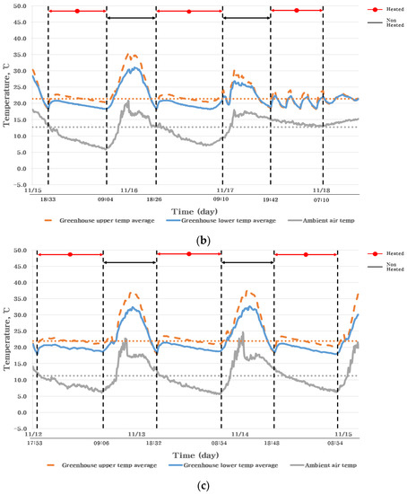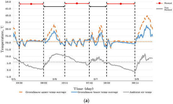 Statistical analysis was conducted to confirm the significance of the comparative analysis between the experimental groups. The statistical program, SAS v9.4 (SAS Institute, Inc., Cary, NC, USA), was used, and the analysis was performed using Duncan’s multiple range test. Given that the heating experiments were conducted in connection with external weather, repeating them was challenging. Therefore, the effective data obtained during the experiments were assumed to be a single data sample per day.
