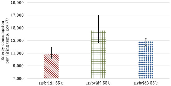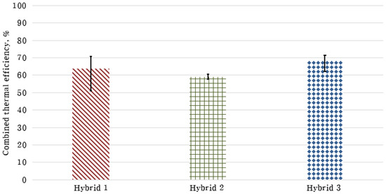 A comparison of the combined thermal efficiencies is shown in Figure 10 and Table 5 and Table 6. The thermal efficiency was highest at 68.1% in hybrid system 3. Considering hybrid systems 1 and 3, which involved the use of the hydrothermal heat pump, the average and maximum COP were 2.73 and 3.47 and 2.29 and 3.16, respectively. For hybrid system 2, which involved the use of the heat pump, the average COP was 2 because of the partial load operation of the inverter using the PID control that was built into the heat pump used in this study. Further, statistical analysis showed that all three experimental groups, which did not show any significant differences, could be classified under group A.