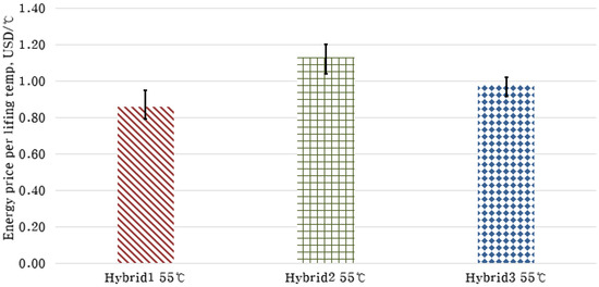 A comparison of the energy cost with increasing temperature is shown in Figure 12 and Table 8. Hybrid system 1 exhibited the lowest application energy cost at 0.86 USD/h, whereas hybrid systems 3 and 2 showed higher energy costs at 0.98 and 1.13 USD/h, respectively. Unlike energy consumption, the energy cost was obtained by converting energy consumption. However, the cost served as a correction value; thus, it differed from energy consumption. Statistical analysis showed that hybrid system 2 could be classified under group A, while hybrid systems 1 and 3 could be classified under group B. The energy consumption cost corresponding to hybrid system 1 was significantly lower than that corresponding to hybrid system 2 but showed no significant difference compared with that corresponding to hybrid system 3. Additionally, the energy consumption and used energy cost tended to be similar. For the sake of comparison, the ratio of the energy consumption in each system is shown in Table 9.