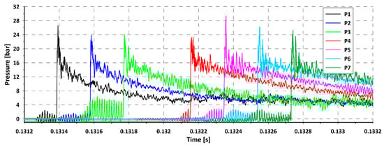 Figure 2 shows an exemplary pressure course from one of the experiments. Those kinds of pressure traces showing a rapid, twenty-fold plus increase in pressure suggest that detonation occurred. Additionally, the velocities of the wave between each sensor were calculated and compared to the theoretical VCJ. In Figure 3a, velocities between consecutive pressure transducers for an initial pressure of 1 bar and different equivalence ratios are presented, showing excellent agreement between the calculated detonation velocities and theoretical values. Figure 3b illustrates an average detonation velocity calculated using the velocities between pressure transducers P4–P5, P5–P6 and P6–P7 compared to the theoretical VCJ. This plot covers the whole range of researched pressures and equivalence ratios. Most of the points differ by no more than 2% from the VCJ, showing very good agreement throughout all the experiments. As expected, detonation velocity increases with the increasing initial pressure of the combustible mixture and equivalence ratio.