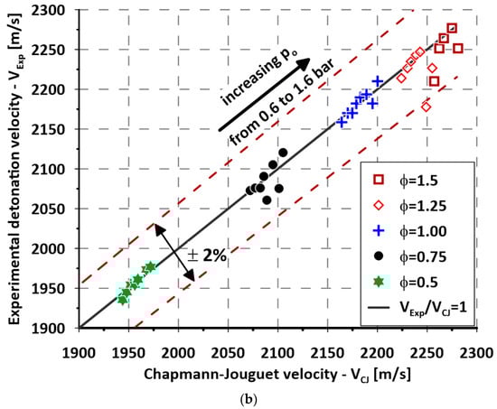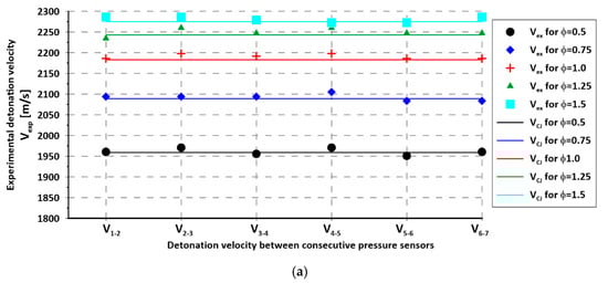 A comparison of detonation velocity from the experiments VExp and theoretical VCJ: (a) detonation velocity calculated between consecutive pressure sensors, initial pressure p0 = 1 bar; (b) average detonation velocity from all the cases compared to theoretical Chapman—Jouguet detonation velocity VCJ.