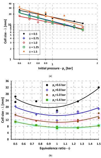 Average cell size dependence on: (a) initial pressure p0; (b) equivalence ratio Φ. Symbols represent experimental results, and continuous lines represent fitted power and polynomial function, respectively, in (a,b).
