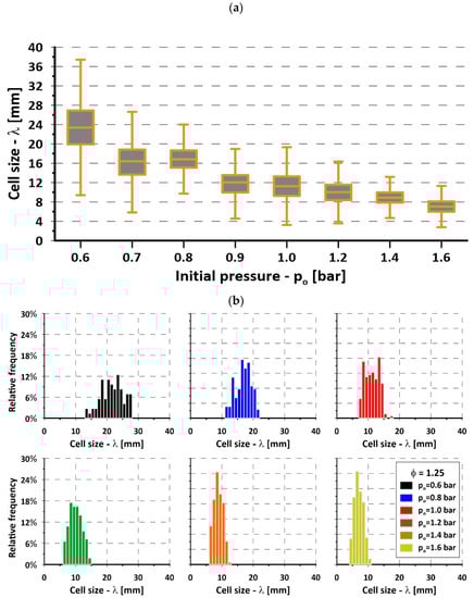 Figure 6 presents the distribution of the data points from the case of Φ = 1.25. Figure 6a shows the box and whiskers plots. The whiskers mark the minimum and maximum values of the measured detonation cell size while the box shows the interquartile range and the horizontal line inside the box shows the mean value of the detonation cell size in each presented case. Figure 6b illustrates the histograms of the data. To produce the histogram, the entire range of values is divided into a series of intervals, and then the data points falling into each interval or “bin” are counted. In the histograms, the Y-axis shows the percentage of all the data points falling into each bin. The data is also offered in tabular form in Table 4 with some additional information: the number of data points, standard deviation, variation and the standard error of the mean. Analyzing Figure 6a, it appears that cell size variation is increasing as initial pressure decreases. However, the spread of measured values is always in the order of its mean, and the value of the coefficient of variation (CV) oscillates around 0.19. The CV is a standardized measure of dispersion that shows the extent of variability in relation to the mean. It is defined as the ratio of the standard deviation to the mean. In the presented results, the average value of CV from all experiments was 0.191, and the standard deviation was 0.027. These results indicate that although absolute variation increases with increasing cell size, the relative variation stays roughly the same throughout the different cases, meaning that the increase in variation comes only from the increase in detonation cell and it is not caused by any kind of methodological error or interaction between experiment’s parameters.