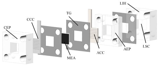 A DMFC generally consists of a cathode current collector (CCC), anode current collector (ACC), membrane electrode assembly (MEA), teflon gaskets (TG), cathode extremity plate (CEP), anode extremity plate (AEP), and liquid storage cavity (LSC) [24,25], as illustrated in Figure 1.