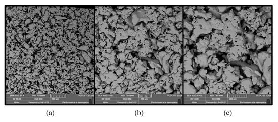 SEM image of stainless-steel foam in different scopes: (a) 50×; (b) 100×; (c) 150×.
