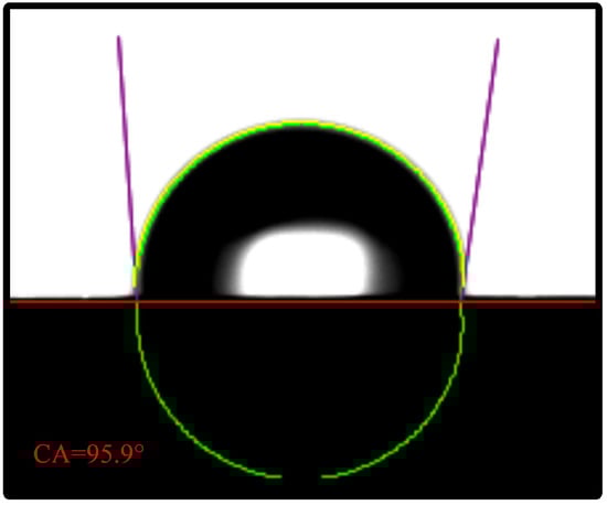 The contact angle of the FSS is shown in Figure 3. The water droplets appear suspended because stainless steel is a hydrophobic material. Its contact angle is 95.9°.