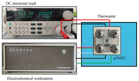 The test platform consists of a DC electronic load (Model IT8511A+), an electrochemical workstation (Model CHI660E), and a thermostat (Model 101-0A), as shown in Figure 6. The voltage–current data were recorded and the EIS was tested. The DMFC was continuously discharged at a current density of 80 mA/cm2 and 70 °C [15,30].