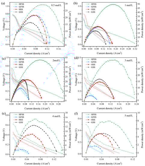 As can be seen in Figure 7, methanol concentrations of 0.5 mol/L, 1 mol/L, 2 mol/L, 3 mol/L, 4 mol/L and 5 mol/L [31] were used. The maximum current density, the maximum power density, and the operating voltage increase with the FSS were compared to the SS DMFC. The power density of the DMFC sharply decreased at higher current densities. The decrease in power density was mainly due to the fact that the replenishment of the methanol solution at high temperatures does not meet the rate of the electrochemical reaction [32]. When the concentration increased from 0.5 mol/L to 5 mol/L, the power density and current density increased and then decreased because the low concentration of methanol solution cannot meet the electrochemical reaction rate, and the methanol permeation phenomenon will occur when the concentration reaches the value—thus leading to overpotential [33,34,35,36]. The maximum powers of different types of DMFC at different concentrations are shown in Table 1.