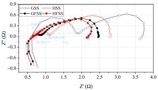 In the Nyquist diagram, the right intercept of the real axis represents the transfer resistance of the electrode reaction. The larger the charge transfer resistance (CTR) value, the more severe the polarization during the electrode reaction [32,39]. As can be seen in Figure 8, the right intercept of the Nyquist plot from the real coordinate axis for HFSS-DMFC, GFSS-DMFC, HSS-DMFC, and GSS-DMFC is 2.17 , 2.48 , 2.81 and 3.67 , respectively. Among them, the mass transfer impedance of DMFC with the same material is the same, while there is variability in the charge transfer impedance. The CTR of DMFC with a hole-type flow field is smaller than that of a DMFC with a grid-type flow field.