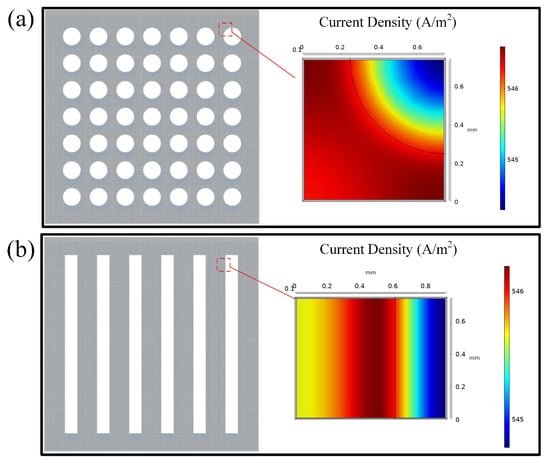 Current density of aperture type flow field collectors and grid type flow field collectors: (a) Hole-type; (b) Grid-type.