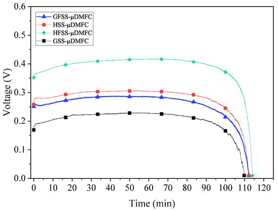 The discharging tests are conducted under a current density of 80 mA/cm2 at 70 °C, and the fuel cell reservoir chambers are filled with 2 mL methanol (1 mol/L). The voltage of different types of DMFC are shown in Figure 10.
